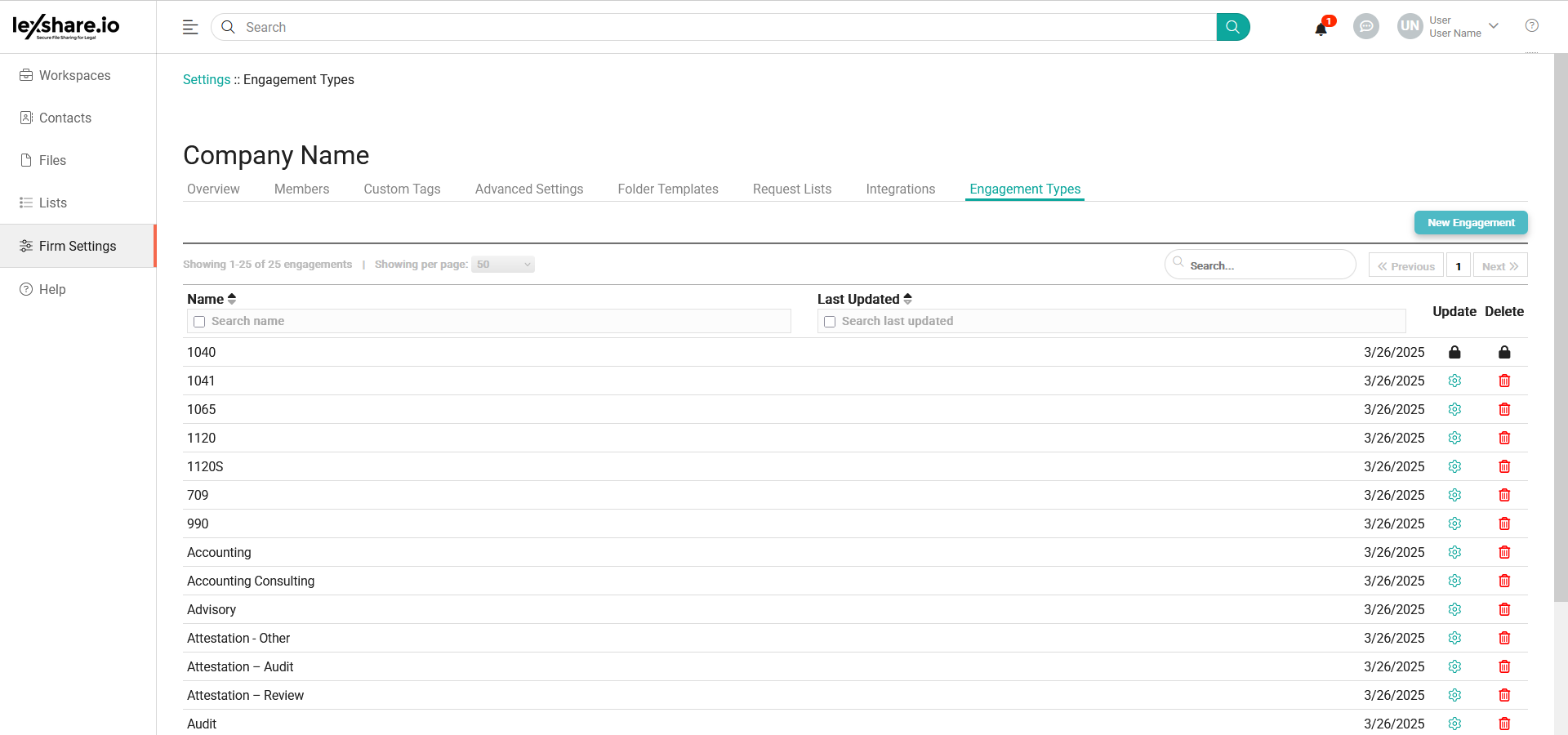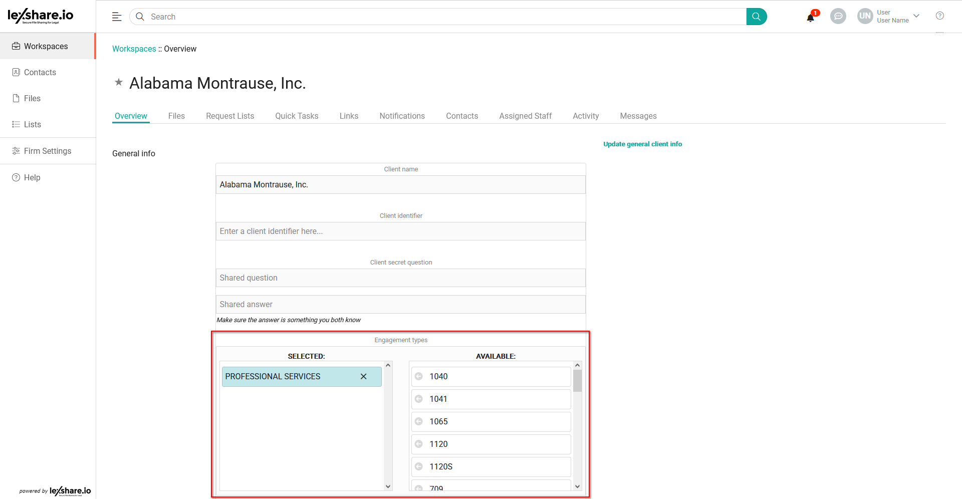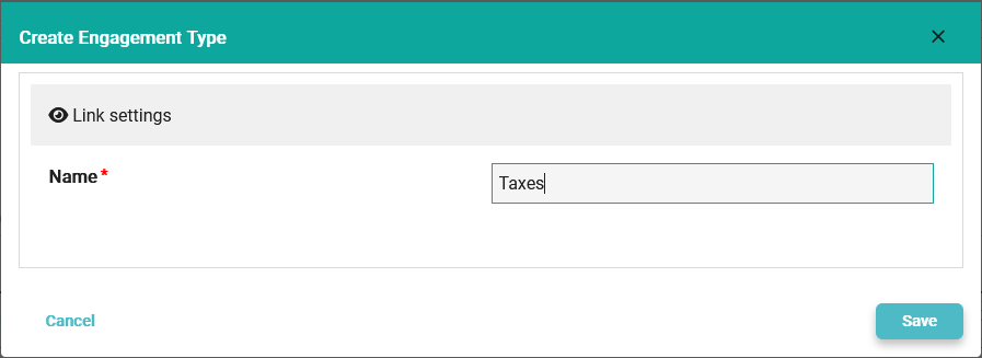 Engagement Types are used to identify a type of work being performed for clients. Although optional, Engagement Types provide an easy way to identify cases and allow you to filter your workspaces.
