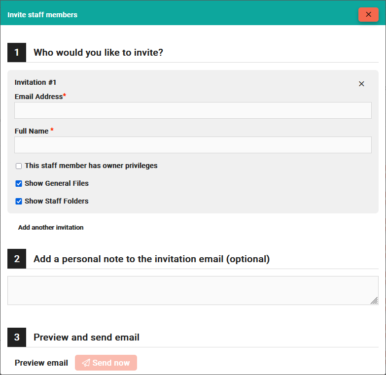 - Click Invite Staff and select Create new staff to display the Invite Staff Members window.