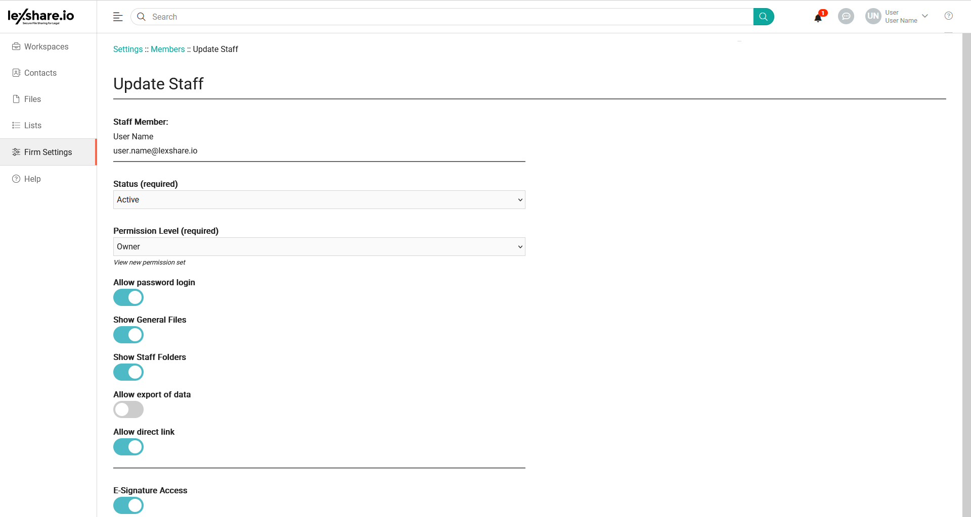 - Owner – Users with Owner permissions have full access to all features in LexShare, including Firm Settings; can access all files and workspaces, including General Files and Staff Files, and can apply folder templates.