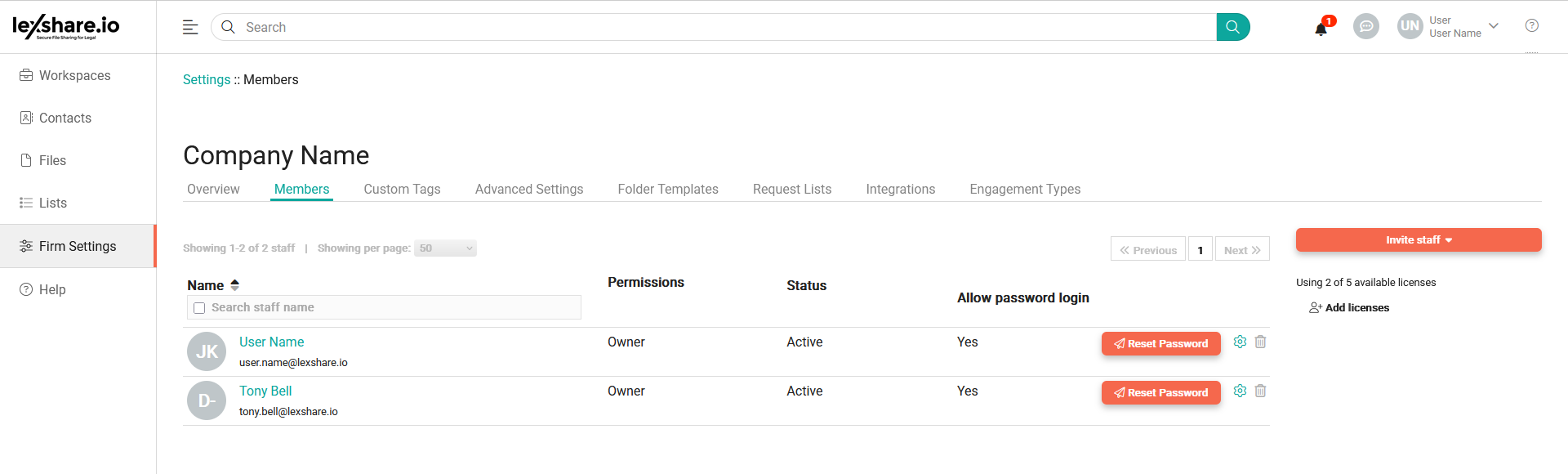 Each user is configured as a Staff Member, and can be assigned specific permissions in LexShare. Additionally, members can set up their own profile information, preferences, and sign-in options.